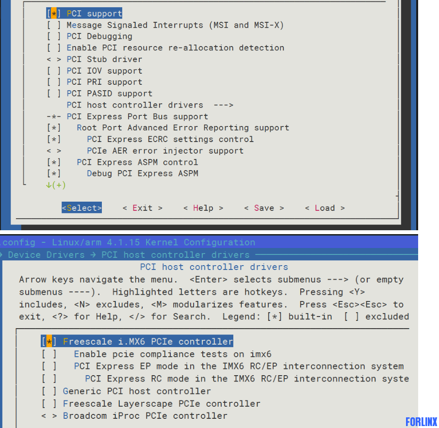 | pice在初始镜像中并没有使用,如果有需要使用pcie的需求可以根据下图配置 在内核中配置pcie的使用 通过make menuconfig 找到下图中的两个位置分别将总线支持和pcie编译进内核(其余的选项可以根据自己需求来配),重新烧写的镜像可以使用lscpi查看到pcie设备 |