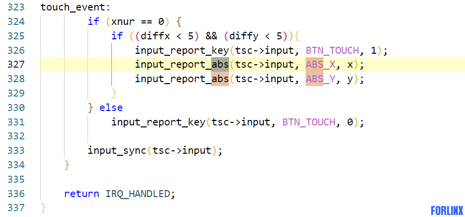 ABS_PRESSURE 3. ts_print / ts_print_raw 二者的区别在于ts_print打印出来的是经过tslib处理后的数据,ts_print_raw打印的数据是tslib处理之前的数据。 4. evtest Evtest不仅可以打印原始数据,也可以看到事件类型。 四、 驱动层处理思路 1. 通过查看设备信息,在内核源码中找对应驱动 可以在内核源码中找对应的字符串; 2.定位触摸报点位置,可以在对应驱动中找字符串ABS; 上图为电阻屏触摸驱动 3.加打印信息,进一步处理; 五、 应用层处理 1.通过ts_test等工具查看tslib有没有拿到数据; 2.更换tslib版本; 六、 电容屏 理论上电容屏可以不经过触摸校准,只不过不经过触摸校准可能会出现触摸效果与实际相反,需要反转触摸; 但实测如果屏幕上报数据与实际分辨率不符,qt低版本可能处理不了,需要经过手动校正; |