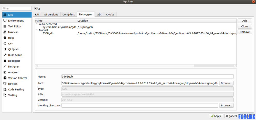 虚拟机中在线调试QT程序的方法 之前使用Qt生成二进制文件后,将二进制文件copy到开发板中,在应用Qt时这样的操作过于麻烦。以下方法为解决这个问题,对Qt进行的一些配置,最终结果为在虚拟机中Qt界面点击绿色按钮“run”即可在开发板中运行,不再需要copy二进制文件。这边使用QT4.7进行调试。 1、添加gdb调试工具 2、在Kits中为对应Qt套件选择添加的gdb调试工具 3、通过ssh连接设备 总结: